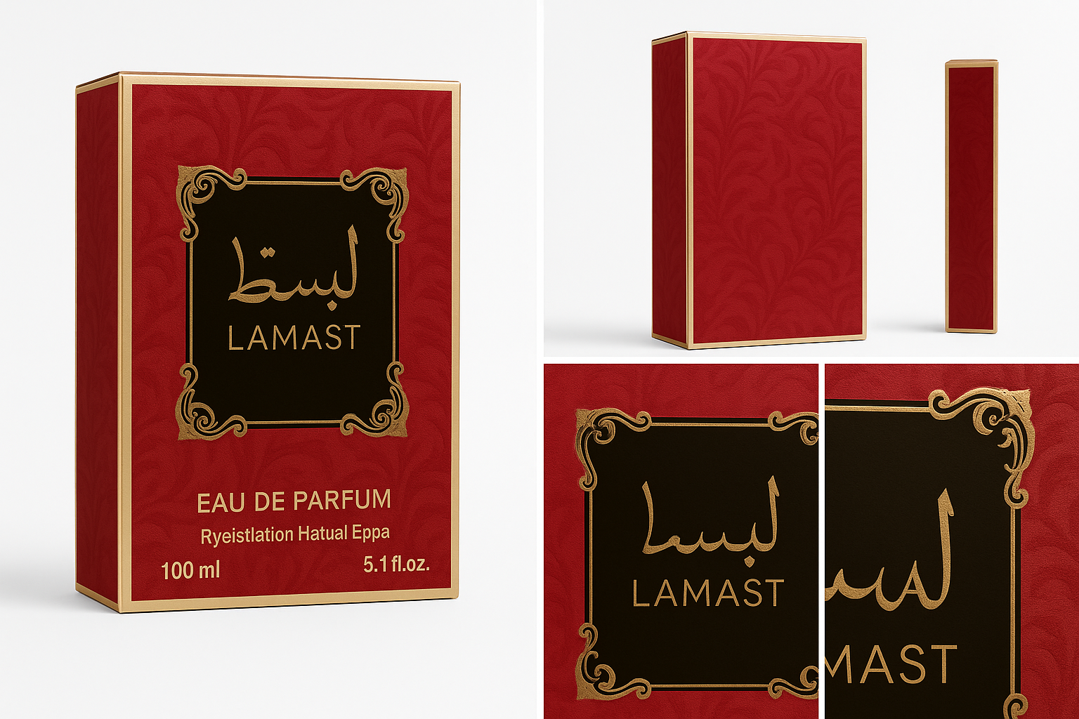La confezione di Lamast è un'opera d'arte: il rosso intenso simboleggia la passione e la forza, mentre le decorazioni dorate in stile arabesco rappresentano l'eleganza e la tradizione. La calligrafia araba dorata aggiunge un tocco di autenticità e prestigio.